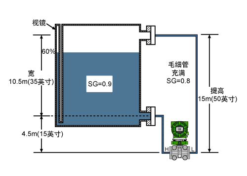 量程是比重與過程垂直距離相乘的結果: 圖1. 10.5x0.9 = 9.45 mH2O (31.5 inH2O)。